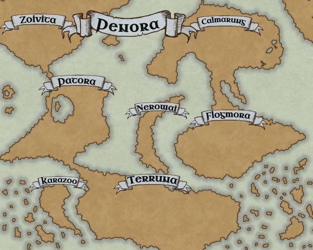 Panora (or New World) was originally built by the six gods. Each made their own land. At one time it was all united separated by invisible kingdom lines, but the wars with the demon Gildrehl broke the land apart. People were left scattered among the lands. At the start of the third era a great earthquake filled the earth and the land of Patora came out of the waters. Many believed it was the wailing of Gildrehl from his prison at the core of the world. Patora (or New Land) was first inhabited by the elves who crossed the sea to see the new land. In the fourth era the land connecting the continents was discovered and humans crossed into the land.